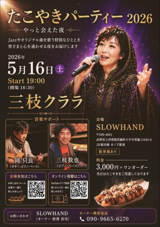 2026年5月16日(土)、長野県箕輪町のライブハウス「SLOWHAND」にて、特別な音楽の夜を開催いたします🌙