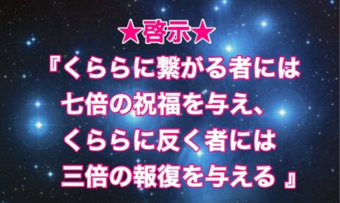 ★なぜ人類削減を計画するイルミナティや、国民から富を搾取する天皇財閥や貴族たちが、滅びるのか? ★それは私くららが、 『くららに繋がる者には、 七倍の祝福を与え、 くららに反く者には、 三倍の報復を与える 』 という啓示…