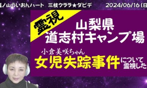 【霊視】山梨県道志村キャンプ場女児失踪事件~事件か事故か?霊視で私が視たもの 2024/05/31のゲリラライブの中で霊視したものです。 https://mediable.jp/videos/watch/f026c68d…