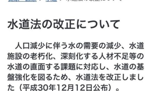 ◆安倍政権で水道代が5倍になる! 厚生労働省水道事業民営化に関してのホームページ 2018年12月12日、水道事業民営化するための改正水道法が既に可決交付されいてます。 もちろん、水道の払い下げ先は、カバール企業複合体。…
